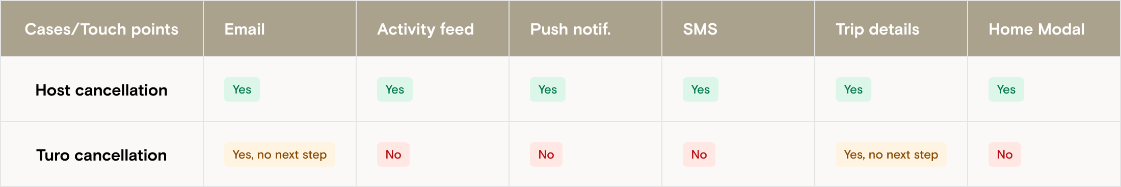 Yellow yes is when the touchpoint exist but without guidance on what to do next, rebooking flow, or what we are doing with the money.