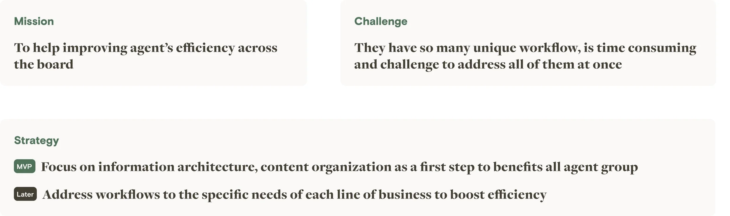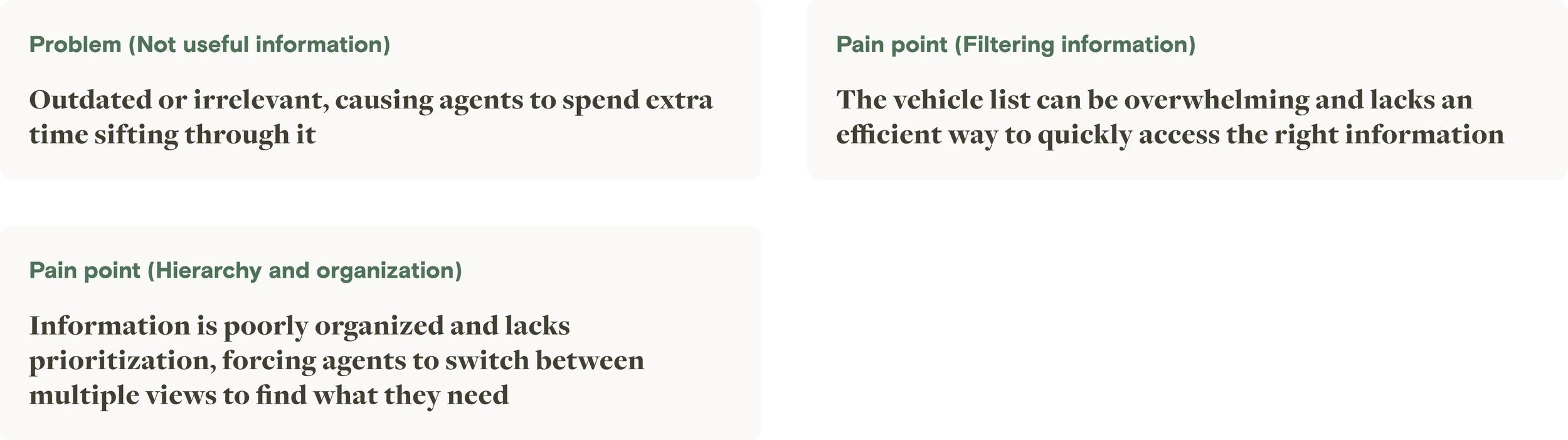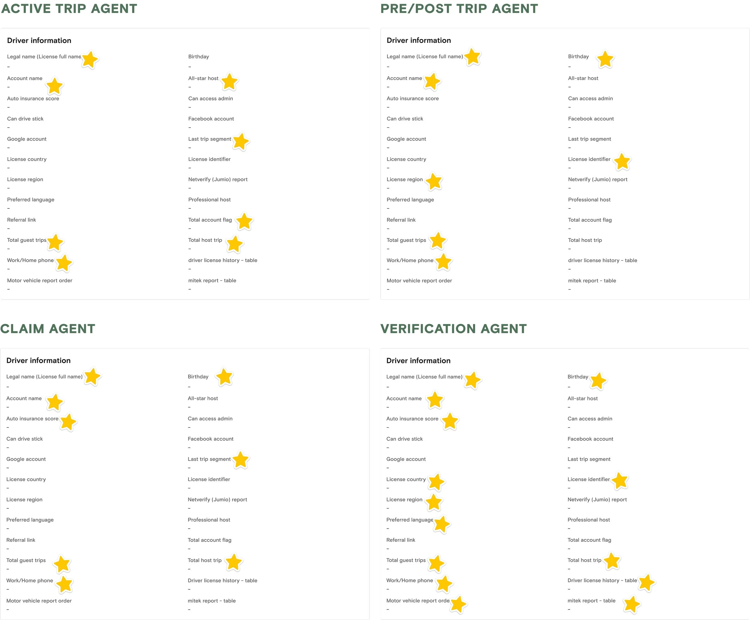 Moderate interview with agents from major lines of business to prioritize the information in each category (Information, status, reports, status, vehicle)